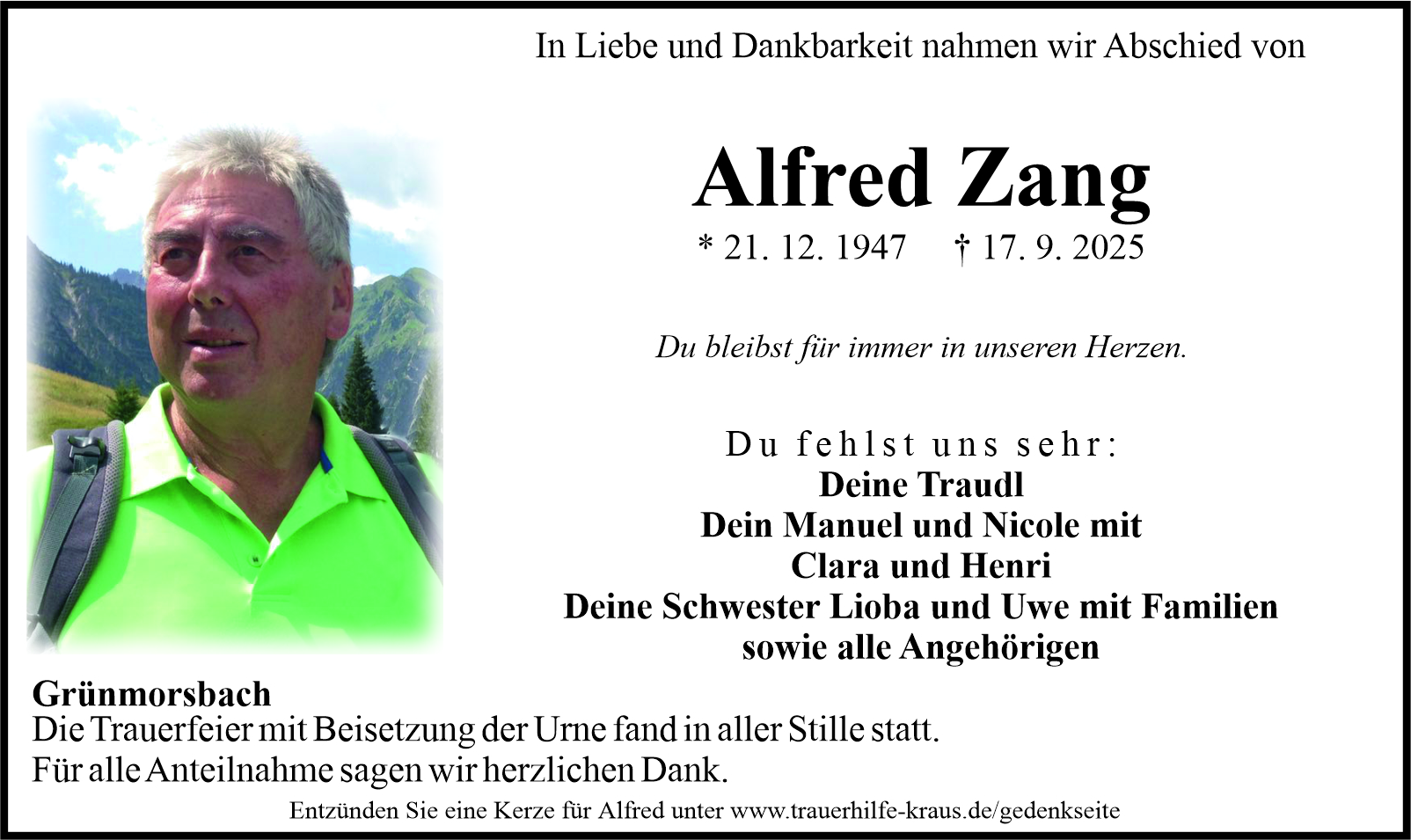 Michael und Sabine Kraus schrieb am 24.09.2025 Liebe Angehörige, in dieser Zeit des Schmerzes wünschen wir Ihnen Kraft, den Verlust im Kreise Ihrer Liebsten zu verarbeiten. Als Zeichen unserer Anteilnahme und des Gedenkens entzünden wir diese erste Kerze. Möge diese Gedenkseite Ihnen helfen, Erinnerungen zu teilen und so das Andenken gemeinsam wachzuhalten. Raggl Gerda u Hans schrieb am 01.10.2025 Liebe Traudl, Lieber Manuel mit Fam. Was im Herzen liebevolle Errinnerungen hinterlässt und unsere Seelen berührt, kann weder vergessen noch verloren gehen. Unsere Aufrichtige Anteilnahme und viel Kraft für diese schwere Zeit! Mögen die schönen Errinnerungen an euren Alfred euch immerwieder ein Lächeln ins Gesicht zaubern! Gerda und Hans Raggl Iris Krämer geb. Deml schrieb am 01.10.2025 Hallo Traudel, mein herzliches beileid. Habe Alfred gerne gemocht. LG Claudia Neubauer schrieb am 01.10.2025 Lieber Alfred, Ruhe in Frieden. Wir werden Dich als lieben, freundlichen und immer herzlichen Menschen in Erinnerung behalten. Deiner Familie viel Kraft und Hoffnung in dieser schweren Zeit. Diane Halmen schrieb am 01.10.2025 Unvergessen. Danke, lieber Alfred, für all die guten Kindheitserinnerungen. In tiefem Mitgefühl für Traudl, Manuel und die ganze Familie, grüßen die Familien Halmen und Konrath Norbert Mayer schrieb am 01.10.2025 Lieber Alfred, RIP. Wir durften Dich als herzensguten, lieben, immer zu Späßen aufgelegten und jederzeit hilfsbereiten Menschen kennenlernen. So bleibst Du uns in guter Erinnerung. Unser Mitgefühl gilt Deiner Frau und Deiner gesamten Familie. Mit stillem Gruß, Norbert Mayer auch im Namen des OGV Grünmorsbach Pia Naeve schrieb am 01.10.2025 Liebe Traudl, Keine Worte können über den Verlust hinweg helfen, keine Taten den Tod ungeschehen machen. Wir wünschen euch viel Kraft und ein Lächeln im Gesicht, wenn ihr an Alfred denkt. Wie gerne sind wir mit Euch nach Walldürn gelaufen. In stillem Gedenken Die Walldürn Wallfahrer aus Schweinheim Ilse Palasthy-Mungel schrieb am 02.10.2025 Lieber Schwager, Du bleibst uns unvergessen und deshalb immer in unserer Mitte, Ilse Ruhe in Frieden Dietz Monika schrieb am 02.10.2025 Lieber Alfred, Ruhe in Frieden J. Rohe schrieb am 07.10.2025 Lieber Alfred, ruhe in Frieden Ulrike Bräutigam schrieb am 05.10.2025 liebe Traudel, wir möchten Dir unser tiefempfundenes Beileid aussprechen Dein früheresler-Team Ulli, Inge, Elke, Traudel, Susi und Margit Brigitte Sauer schrieb am 05.10.2025 Lieber Alfred, als herzensguter lieber Mensch wirst du immer in unseren Herzen bleiben. Deiner Familie viel Kraft in dieser schweren Zeit. Martina Hock-Dachs schrieb am 12.10.2025 Liebe Traudl, Ich möchte dir und deiner Familie mein herzlichstes Beileid aussprechen. Ich wünsche dir und deiner Familie viel Kraft und Zuversicht. Gerne bin ich und mein verstorbener Mann mit euch nach Walldürn gelaufen