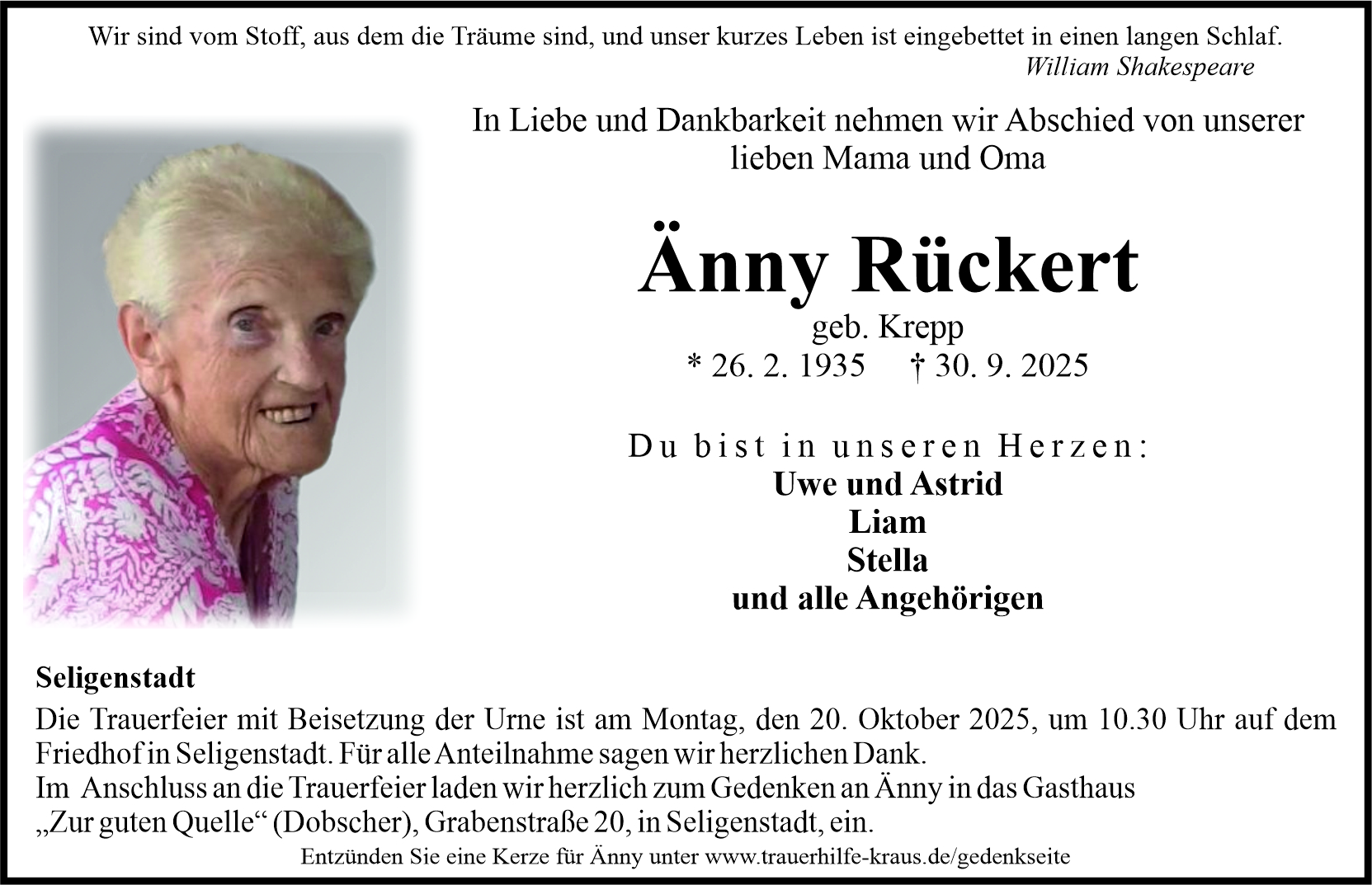 Michael und Sabine Kraus schrieb am 06.10.2025 Liebe Angehörige, in dieser Zeit des Schmerzes wünschen wir Ihnen Kraft, den Verlust im Kreise Ihrer Liebsten zu verarbeiten. Als Zeichen unserer Anteilnahme und des Gedenkens entzünden wir diese erste Kerze. Möge diese Gedenkseite Ihnen helfen, Erinnerungen zu teilen und so das Andenken gemeinsam wachzuhalten. Reinhilde Windorfer schrieb am 11.10.2025 Eine Kerze, ein Licht leuchtet - sie erinnert an viele gemeinsame Stunden mit viel Lachen und auch an Gespräche über Die, Die schon voraus gegangen sind. Vielleicht gibt es ja ein Wiedersehen. Moni Kemmerer schrieb am 12.10.2025 Liebe Änny, nun bist Du Deine letzte Reise angetreten und ich entzünde eine Kerze für Dich, die Dir den Weg ins Licht weisen wird. Unsere Gedanken werden Dich begleiten und gerne erinnere ich mich an die vielen Begegnungen die wir hatten. Wir wünschen Deiner Familie viel Kraft für die Zeit der Trauer und die Hoffnung und den Glauben an ein Wiedersehen. Ruhe sanft in Gottes Hand. Martina Sarker schrieb am 13.10.2025 Liebe Änny, nun ist der Tag gekommen, der unausweichlich ist und den wir so manchmal herbeisehnen und dann auch gerne wieder weit weg schieben. In meinen Gedanken bleibst Du immer lebendig, so wie Du mit uns gelebt und gelacht hast. Martina