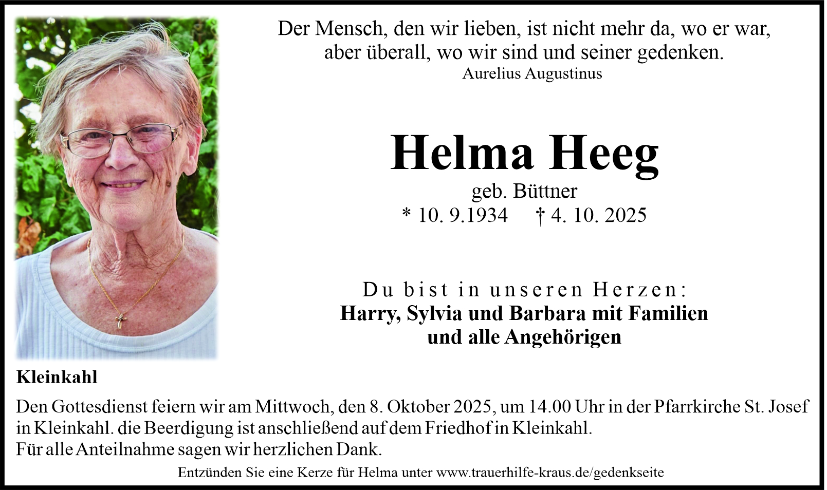 Michael und Sabine Kraus schrieb am 06.10.2025 Liebe Angehörige, in dieser Zeit des Schmerzes wünschen wir Ihnen Kraft, den Verlust im Kreise Ihrer Liebsten zu verarbeiten. Als Zeichen unserer Anteilnahme und des Gedenkens entzünden wir diese erste Kerze. Möge diese Gedenkseite Ihnen helfen, Erinnerungen zu teilen und so das Andenken gemeinsam wachzuhalten. Jutta und Jochen schrieb am 06.10.2025 Ihr Lieben, wir haben heute in unserem Urlaub von Helmas "Heimreise" erfahren. Fühlt euch alle umarmt! Ganz liebe Grüße Reinhild und Horst Büttner schrieb am 07.10.2025 Liebe Angehörige, ganz leise ohne Wort, gingst du fort, doch die Liebe und die Erinnerung werden bleiben. Viel Kraft und Trost sendet Reinhild und Horst, Denise und Christian, Fabienne Bianca schrieb am 08.10.2025 Steffi Müller schrieb am 08.10.2025 Liebe Sylvia, meine aufrichtige Anteilnahme zum Tod deiner Mama. Fühl dich ganz fest umarmt !