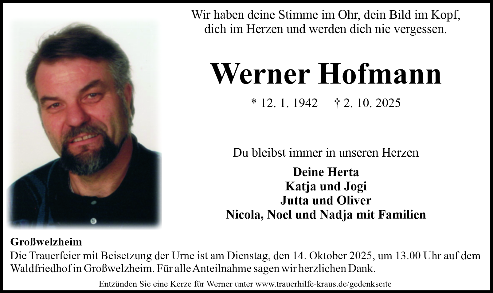 Michael und Sabine Kraus schrieb am 08.10.2025 Liebe Angehörige, in dieser Zeit des Schmerzes wünschen wir Ihnen Kraft, den Verlust im Kreise Ihrer Liebsten zu verarbeiten. Als Zeichen unserer Anteilnahme und des Gedenkens entzünden wir diese erste Kerze. Möge diese Gedenkseite Ihnen helfen, Erinnerungen zu teilen und so das Andenken gemeinsam wachzuhalten. Oswald Weigand schrieb am 10.10.2025 Ruhe in Frieden! Marianne und Oswald Sonja Hofmann schrieb am 10.10.2025 Ruhe in Frieden! Die Nachbarschaft Oswald und Sonja Hofmann Edgar Stephan schrieb am 10.10.2025 Ruhe in Frieden - mein aufrichtiges Beileid an die Angehörigen. Gabriele Bayer schrieb am 11.10.2025 Ruhe in Frieden Mein herzliches Beilad an die Angehörigen Erika Born schrieb am 12.10.2025 In lieber Erinnerung Eri Born Siglinde Kampfmann schrieb am 12.10.2025 In stillem Gedenken Fam. Siggi Kampfmann