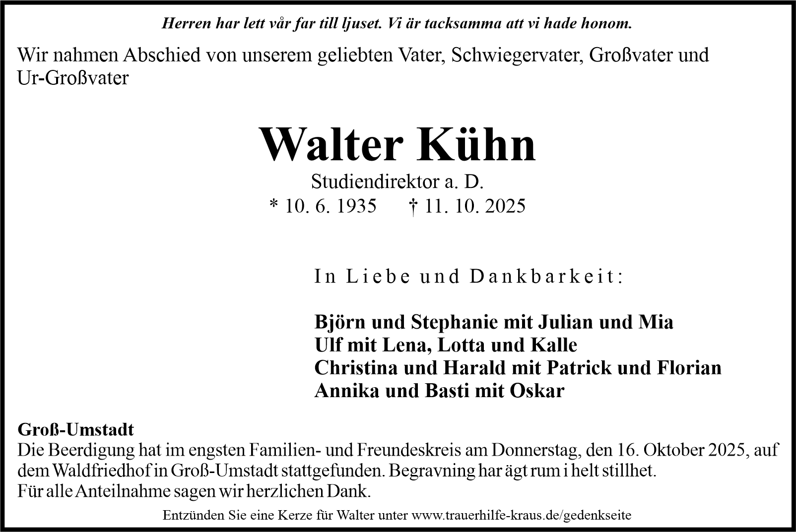 Michael und Sabine Kraus schrieb am 08.08.2025 Liebe Angehörige, in dieser Zeit des Schmerzes wünschen wir Ihnen Kraft, den Verlust im Kreise Ihrer Liebsten zu verarbeiten. Als Zeichen unserer Anteilnahme und des Gedenkens entzünden wir diese erste Kerze. Möge diese Gedenkseite Ihnen helfen, Erinnerungen zu teilen und so das Andenken gemeinsam wachzuhalten. Monika Venuleth-Schwemler schrieb am 15.08.2025 Es tut mir sehr leid. Ich wünsche Euch allen viel Kraft. Möge er in Frieden ruhen. Petra. Peter und Alisha schrieb am 15.08.2025 Das schönste was ein Mensch hinterlassen kann, ist ein Lächeln derjenigen, die an ihn denken …… lieber Walter, wir werden dich nicht vergessen Ruhe in Frieden Wolfgang u Rita und Alexander Haßmüller schrieb am 15.08.2025 Wir sind sehr traurig vom Tod von Walter erfahren zu haben. Er möge in Frieden ruhen. Unser aufrichtiges Beileid. Wir werden ihn nicht vergessen. Liebe Doris, dir und deinen Kindern viel Kraft für die nächste Zeit. Kathrin Loos schrieb am 15.08.2025 Lieber Papa lieber Opa, wir vermissen die schönen und lustigen Momente mit dir. Du fehlst uns hier sehr Petra. Peter und Alisha schrieb am 15.08.2025 Das schönste was ein Mensch hinterlassen kann, ist ein Lächeln derjenigen, die an ihn denken …… lieber Walter, wir werden dich nicht vergessen Ruhe in Frieden Doris Weitz schrieb am 16.08.2025 Lieber Walter, wir vermissen dich sehr, du wirst uns immer im Herzen bleiben ❤️❤️ Doris, deine Kinder und deine Enkel Ida Loos schrieb am 16.08.2025 Die Erinnerung an Dich ist ein kostbarer Schatz ❤️❤️ Jannis Loos schrieb am 16.08.2025 Der Tod ist nicht das Ende, sondern ein neuer Anfang in Gottes Ewigkeit Ben Hartmann schrieb am 16.08.2025 Wir tragen Dich für alle Zeit in unseren Herzen ❤️❤️ Elisabeth Franzel schrieb am 16.08.2025 „Menschen, die wir lieben, bleiben für immer, denn sie hinterlassen Spuren in unseren Herzen.“ Ben schrieb am 17.08.2025 Lieber Opa, Ich vermisse dich sehr. Danke für die vielen schönen Waldspaziergänge bei denen ich so viel von dir lernen durfte..Danke für die vielen schönen Radtouren, dirch die ich den Zellhäuser Wald in und auswendig kenne.Danke für Alles lieber Opa. Dein Ben Elisabeth Franzel schrieb am 16.08.2025 „Menschen, die wir lieben, bleiben für immer, denn sie hinterlassen Spuren in unseren Herzen.“ Jens Loos schrieb am 16.08.2025 Lieber Walter, ich vermisse Dich sehr. Leider kann ich Dich nicht mehr besuchen kommen. Ich habe unsere gemeinsamen Stunden immer sehr genossen. Stets hast Du mir mit Rat und Tat zur Seite gestanden. Du warst nicht nur mein Schwiegervater, sondern auch einer meiner besten Freunde. Wie gerne habe ich mich immer mit Dir unterhalten. Ich denke sehr oft an Dich! Dein Jens Michaela schrieb am 16.08.2025 Lieber Papa und lieber Opa, Du fehlst uns hier so unendlich. Wir vermissen dich so sehr, es tut so weh das du nicht mehr bei uns bist. Ich hoffe es geht dir gut auf deiner Wolke da oben Marina Neubauer schrieb am 18.08.2025 Das Sichtbare ist vergangen, es bleibt die Liebe und die Erinnerung. Liebe Doris, liebe Michi und liebe Katrin mit Familie mein aufrichtiges Beileid.