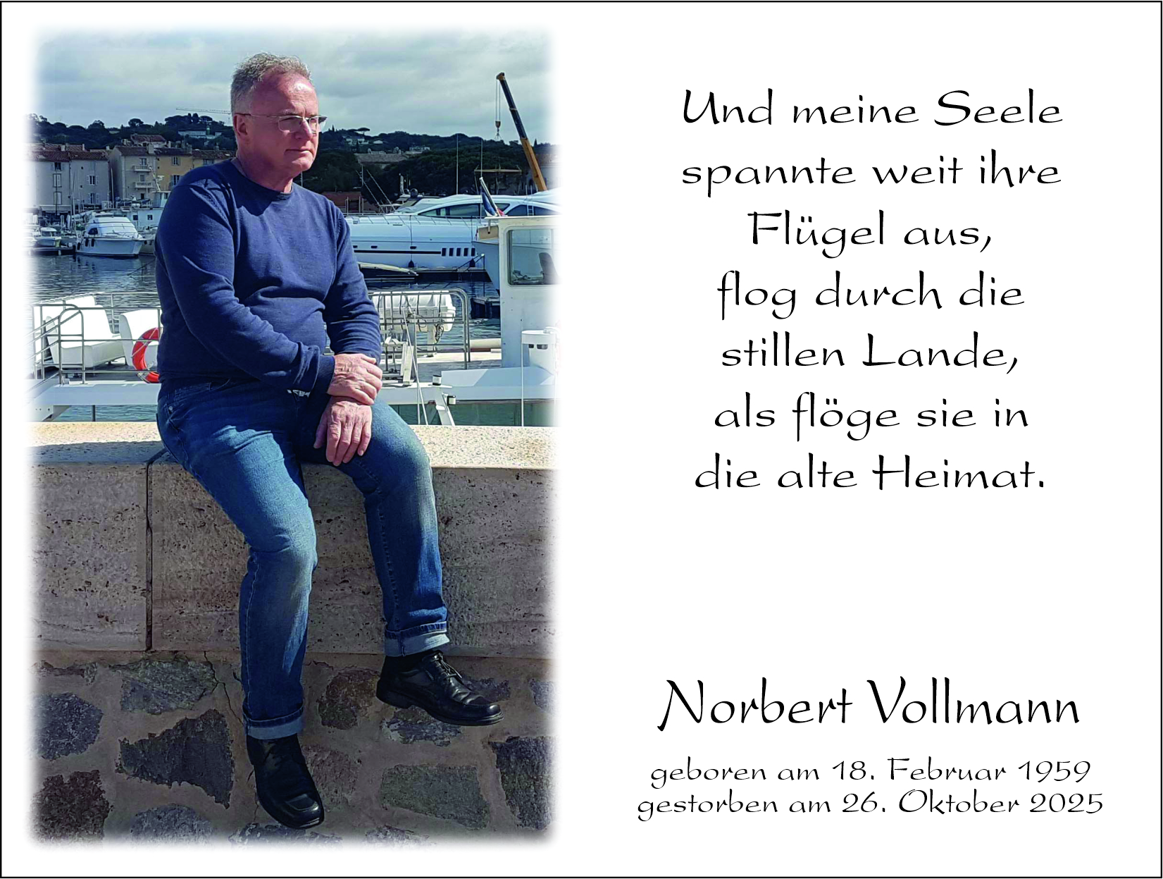 Michael und Sabine Kraus schrieb am 20.02.2024 Liebe Angehörige, in dieser Zeit des Schmerzes wünschen wir Ihnen Kraft, den Verlust im Kreise Ihrer Liebsten zu verarbeiten. Als Zeichen unserer Anteilnahme und des Gedenkens entzünden wir diese erste Kerze. Möge diese Gedenkseite Ihnen helfen, Erinnerungen zu teilen und so das Andenken gemeinsam wachzuhalten. R. Fuchs schrieb am 20.02.2024 In Gedenken an einen lieben Freund, tollen Arbeitskollegen und einfach super Mensch. Gute Reise lieber Volker Michael ,Carmen schrieb am 20.02.2024 „Mit dem Tod eines geliebten Menschen verliert man vieles, niemals aber die gemeinsam verbrachte Zeit.“ Danke dafür. Bernhard Franke schrieb am 20.02.2024 Du wirst immer in unserem Herzen bleiben , gerade , herzlich , treu , vertrauensvoll ,ehrlich. wünschen euch viel Kraft möge diese Kerze für Volker leuchten und uns an die schöne Zeit mit ihm erinnern Gruß Bernhard und Ellen Denise Bohländer schrieb am 20.02.2024 Du wirst uns sehr fehlen. Du hattest immer ein offenes Ohr und gute Ratschläge in vielen Lebenslagen. Ruhe in Frieden lieber Volker Unser aufrichtiges Beileid an die Familie, Angehörigen und Freunde Marco Kuhn schrieb am 20.02.2024 Julian und Fabienne mit Ben schrieb am 20.02.2024 Du bist nicht mehr da, wo Du warst, aber Du bist überall, wo wir sind. Wir werden dich nie vergessen! Gute Reise lieber Volker. Marion Lechner Lindlbauer schrieb am 21.02.2024 Ruhe in Frieden Zotte,Inge,Nick schrieb am 21.02.2024 Wo auch immer Deine Reise hingeht, Du wirst uns immer im Gedächtnis bleiben. Machs gut Zotte Inge Nick Ralf Wilhelm schrieb am 22.02.2024 Moni Krey schrieb am 23.02.2024 Lieber Volker, ich danke Dir für Deine jahrelange Treue, Deine Offenheit, Ehrlichkeit, und die vielen Gespräche. Deine Fürsorge für Deine Familie, Deine geliebte Sky… das Herz immer am rechten Fleck! Ich werde Dich immer in meiner Erinnerung behalten. Ich wünsche Dir bei Deiner letzten Reise alles Gute! Deiner Familie in dieser Zeit viel Kraft und Zuversicht. Du warst ein toller Mensch und Freund. Mach‘s gut Volker! Margit Alles schrieb am 22.02.2024 In ewiger Liebe mein Schatz was man liebt kann man nicht trennen Virginia Hildebrand-Pieri schrieb am 23.02.2024 Lieber Volker! Deine Hülle ist zwar gegangen aber in unseren Herzen und Gedanken bleibst du immer bei uns. Mit deinen lockeren Sprüchen hast du die Menschen zum Lachen gebracht. Mit einem Lächeln verabschiede ich mich somit von dir. Lass es dir gut gehen wo auch immer deine Reise hingeht. Liebe Margit und allen Hinterbliebenen wünsche ich viel Kraft in dieser schweren Zeit. Immer wenn ihr an ihn denkt ..lächelt.. er wird es irgendwo sehen. R.I.P Gini Sabina Ferencak schrieb am 26.02.2024 ..mögest Du den Wind im Rücken haben... ThaiDieter schrieb am 28.02.2024 Ruhe in Frieden ThaiDieter GMC Chiang Mai/Thailand Frank + Carmen schrieb am 01.03.2024 Ein toller Mensch,den man niemals vergisst ! R.I.P. Volker Dennis Millitzer schrieb am 01.03.2024 Alles hat seine Zeit: Sich begegnen und verstehen, sich behalten und lieben, sich loslassen und erinnern. Ich bin froh dir begegnet zu sein lieber Volker und umso mehr schmerzt es zu realisieren das du nicht mehr da bist. Aber du hast einige schöne und lustige Momente, Sprüche und Witze in mein Leben gebracht an die ich mich sehr gerne zurückerinnere. Ich hoffe dort wo du jetzt bist geht es dir gut und du bist von all deinem Leid befreit. Vielleicht sitzt du mit all deinen Freunden und Bekannten dort oben zusammen und unterhältst sie, wie du es hier unten immer gemacht hast. Ruhe in Frieden Volker. Mein aufrichtiges Beileid an die Familie, Angehörigen und Freunde
