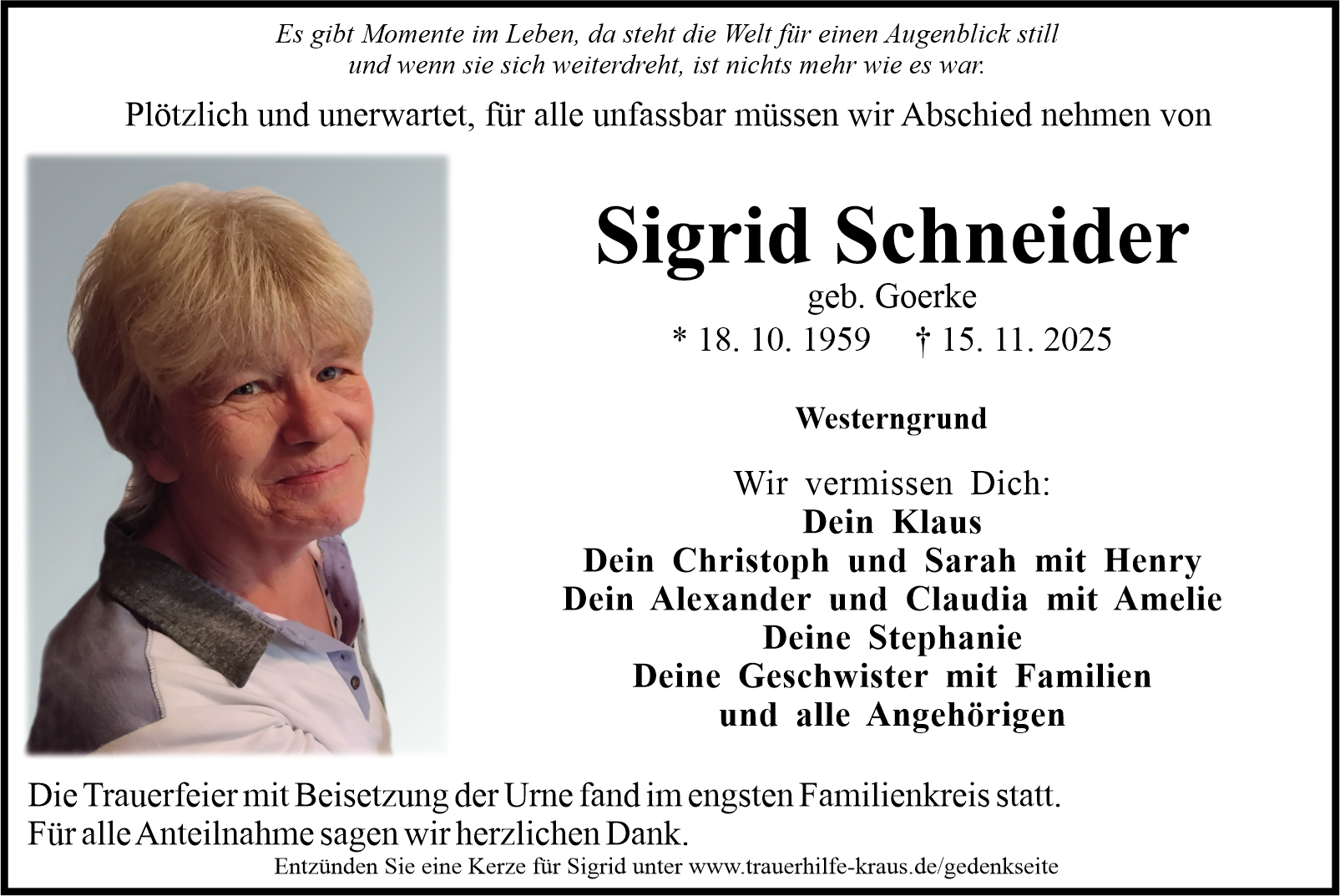 Michael und Sabine Kraus schrieb am 18.11.2025 Liebe Angehörige, in dieser Zeit des Schmerzes wünschen wir Ihnen Kraft, den Verlust im Kreise Ihrer Liebsten zu verarbeiten. Als Zeichen unserer Anteilnahme und des Gedenkens entzünden wir diese erste Kerze. Möge diese Gedenkseite Ihnen helfen, Erinnerungen zu teilen und so das Andenken gemeinsam wachzuhalten. Familie Blüse schrieb am 25.11.2025 "Was bleibt ist die Liebe und die Erinnerung" Von guten Mächten wunderbar geborgen, erwarten wir getrost, was kommen mag. Gott ist mit uns am Abend und am Morgen und ganz gewiss an jedem neuen Tag. Zum Heimgang Eurer lieben Mama, Frau und Oma unsere herzlichste Anteilnahme Familie Blüse Anette u. Willi Elsässer schrieb am 25.11.2025 Lieber Klaus und trauernde Angehörige Es ist sehr schmerzhaft einen geliebten Menschen, die Ehefrau, Mutter, Schwiegermutter und Oma, für immer zu verlieren. Aber nach der Zeit des Schmerzes und der Trauer kommt die Zeit der liebevollen Erinnerung. Sigrid wird in euren Gedanken immer bei euch sein. Herzliches Beileid