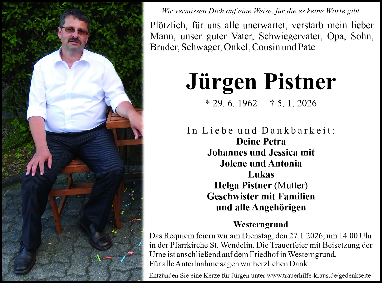 Michael Kraus und Sabine Kraus schrieb am 16.01.2017 unsere ganze Anteilnahme gilt der Familie